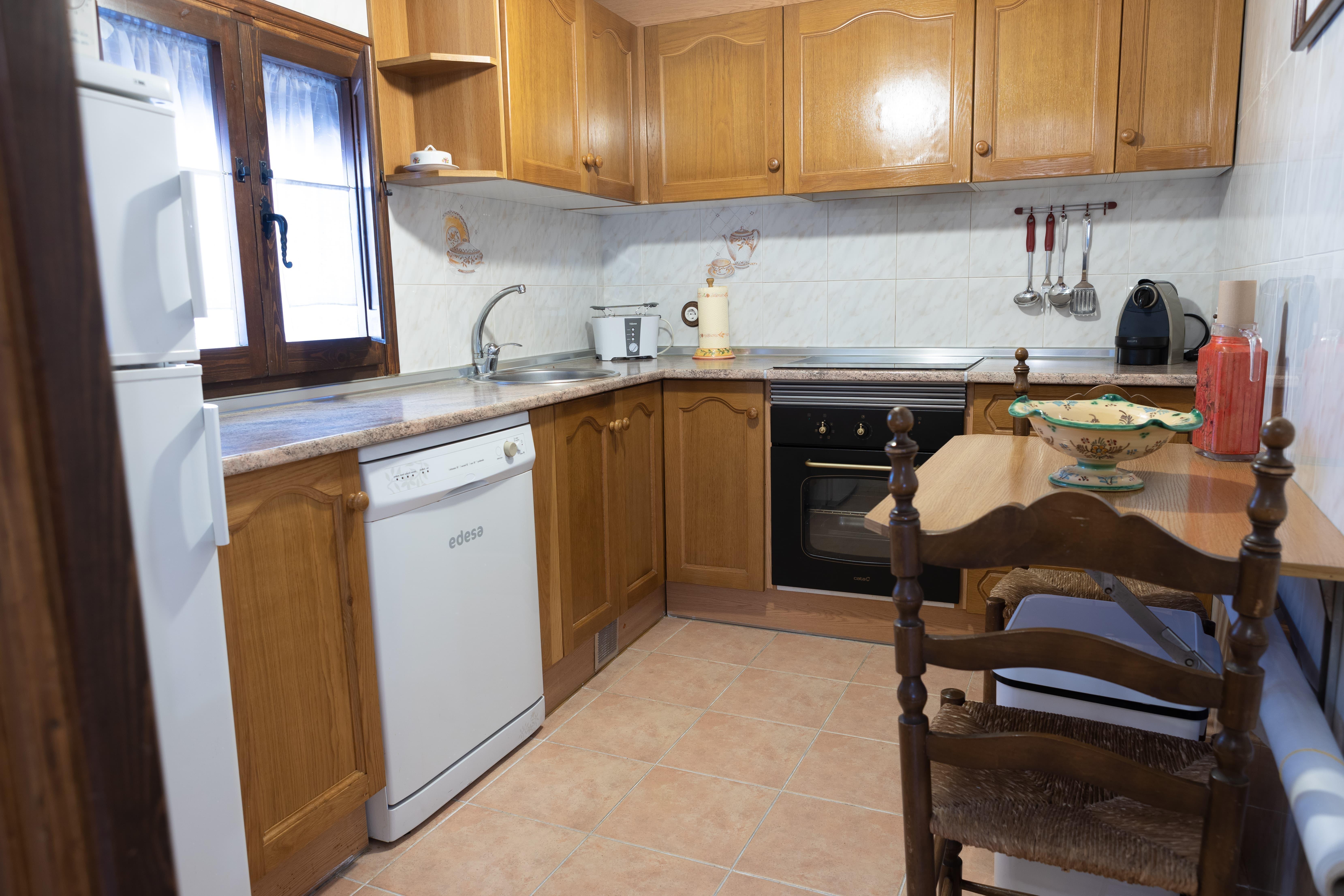 En la primera planta se ubica la cocina, equipada con encimera elécrica, frigorífico, lavaplatos, microondas, cafetera, tostadora, batidora, yogurtera y todo tipo de menaje y utensilios necesarios; un amplio comedor con chimenea y televisor, y una habitación de matrimonio con dosel y un cuarto de baño.
